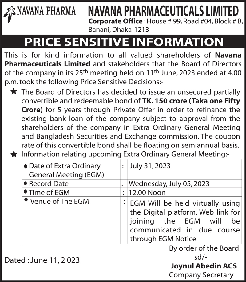 Price Sensitive Information of Navana Pharmaceuticals PLC.