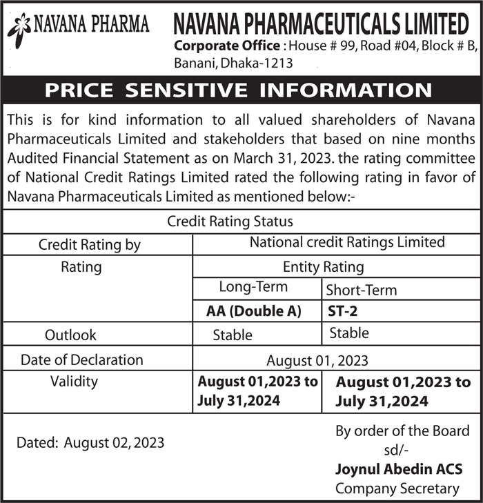 Price Sensitive Information of Navana Pharmaceuticals Ltd