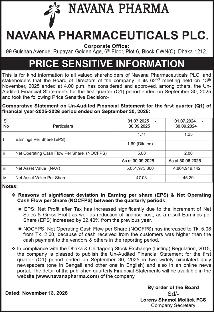 Price Sensitive Information of Navana Pharmaceuticals PLC.