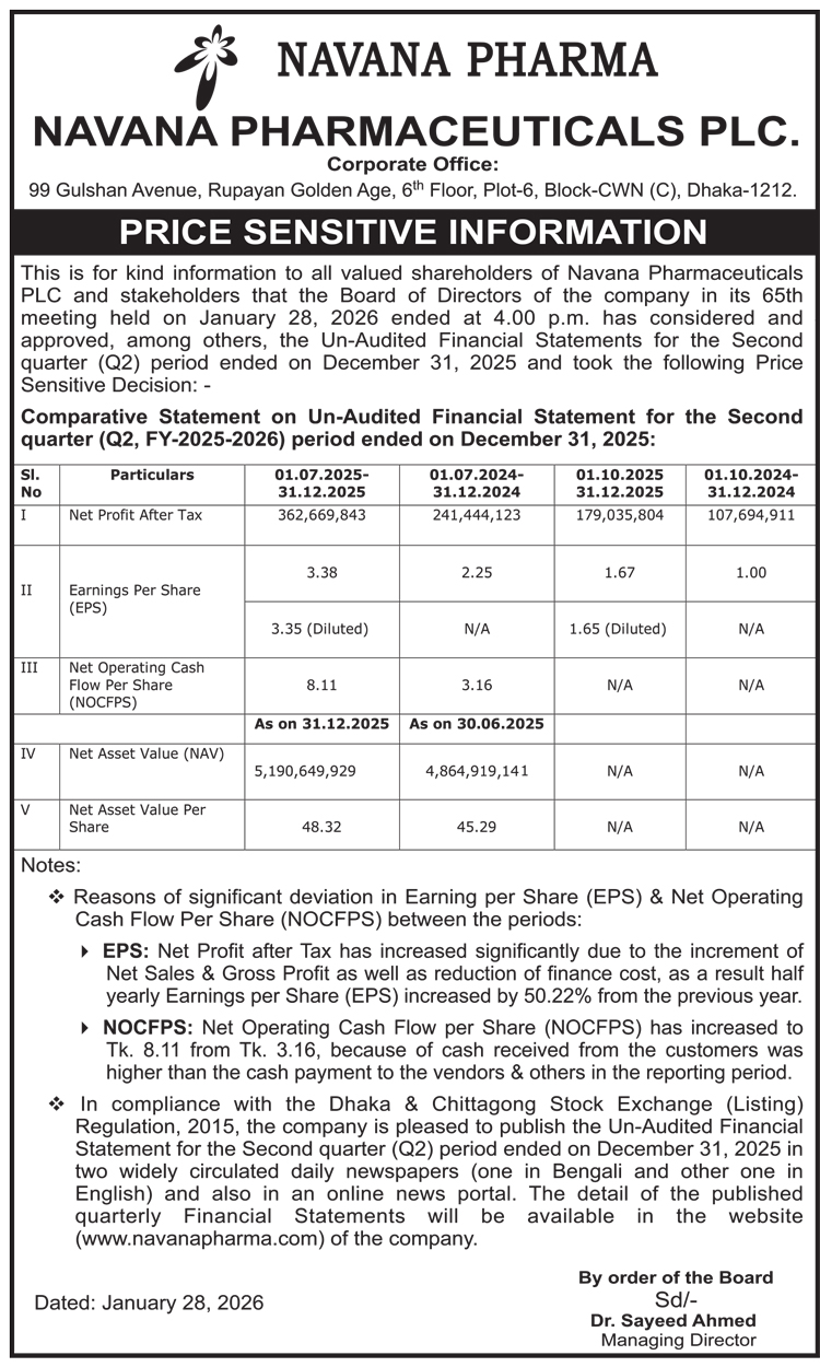 Price Sensitive Information of Navana Pharmaceuticals PLC.