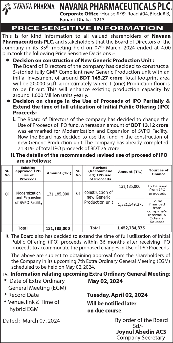 Price Sensitive Information of Navana Pharmaceuticals PLC.