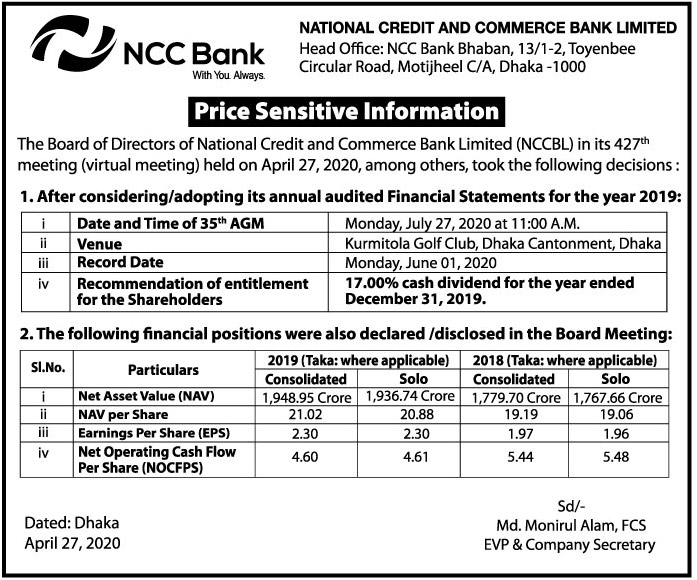 Price Sensitive Information Of NATIONAL CREDIT AND COMMERCE BANK LTD.