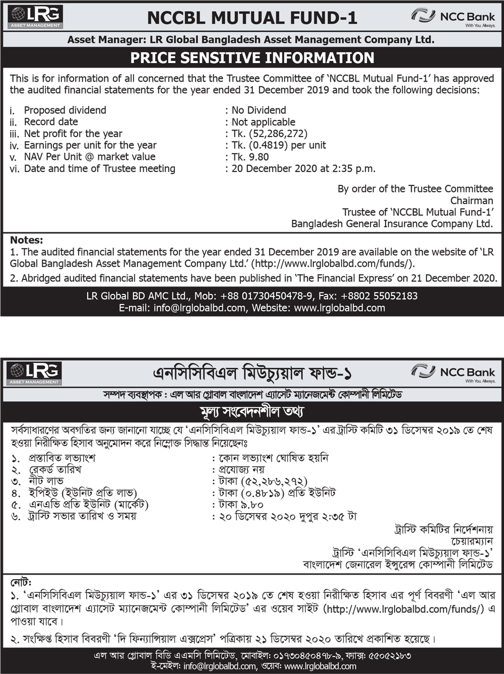 Price Sensitive Information of NCCBL Mutual Fund-1