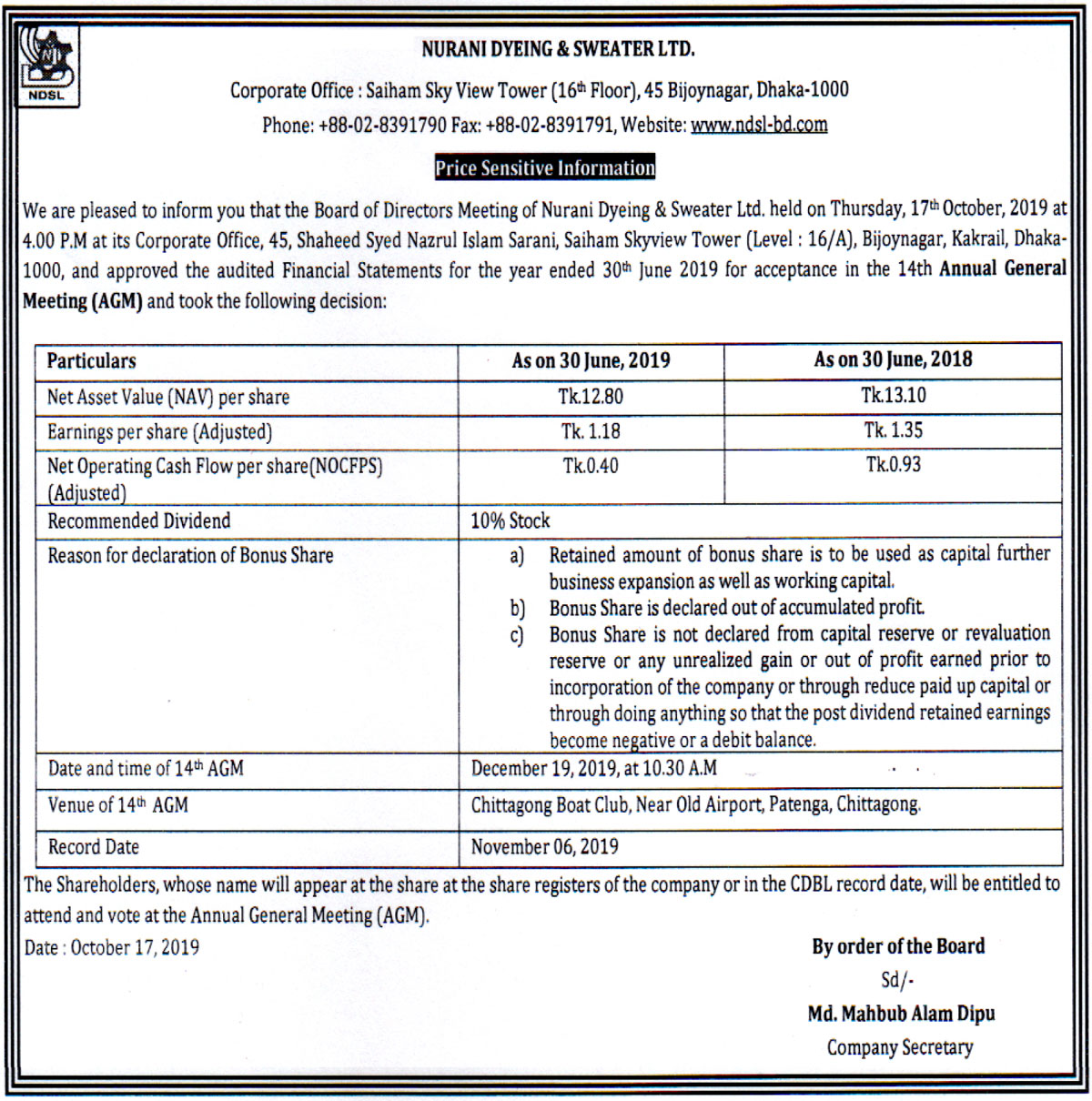 Price Sensitive Information of Nurani Dyeing &Sweater Ltd.
