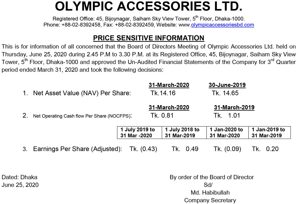 Price Sensitive Information (3Q) Of Olympic Accessories Limited