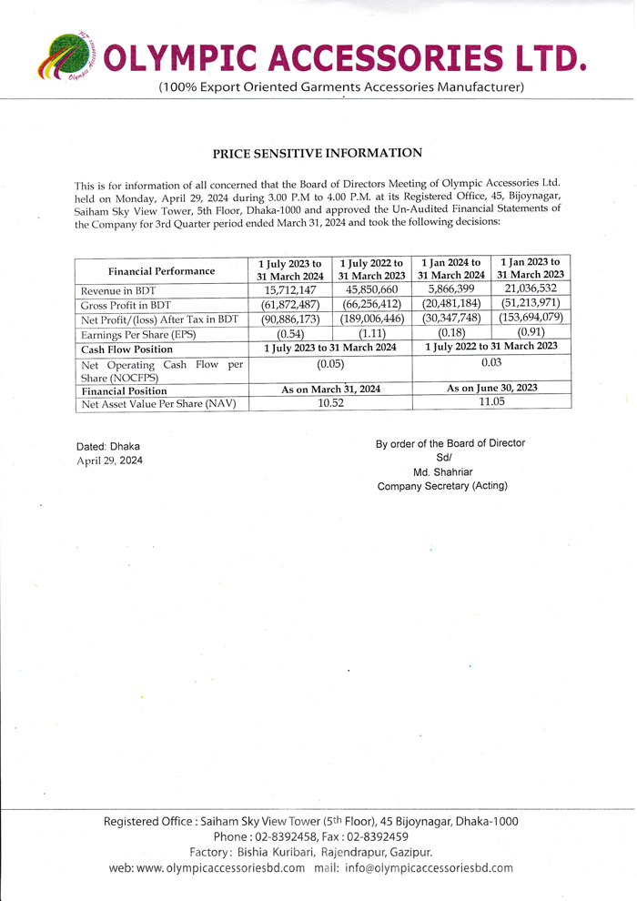 Price Sensitive Information (3Q) Of Olympic Accessories Limited