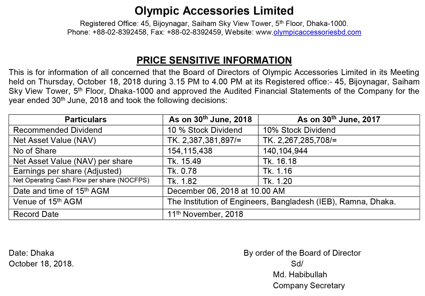 Price Sensitive Information (3Q) Of Olympic Accessories Limited
