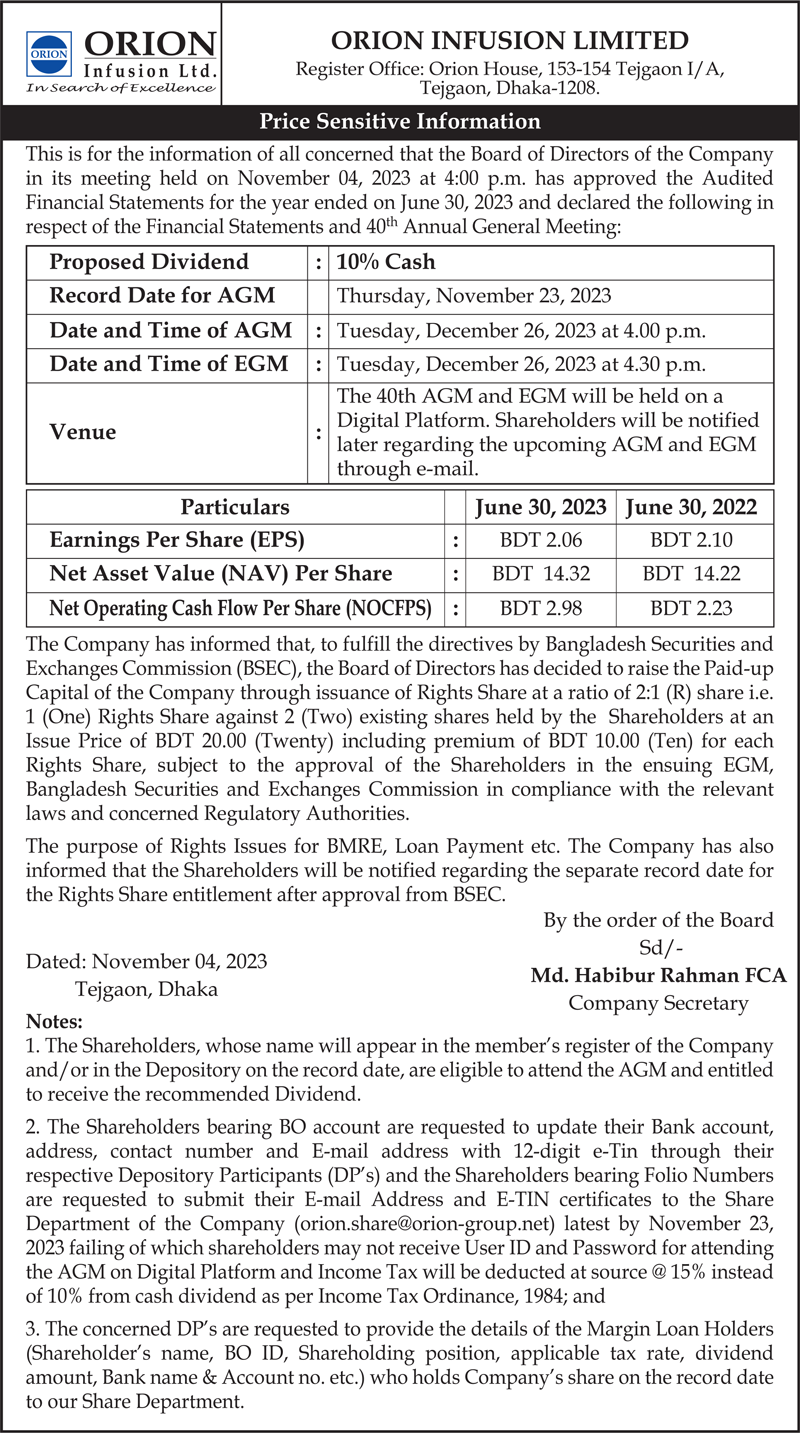 Price Sensitive Information (Q1) of Orion Infusion Ltd