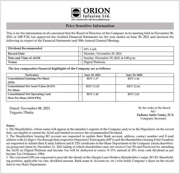 Price Sensitive Information (Q1) of Orion Infusion Ltd