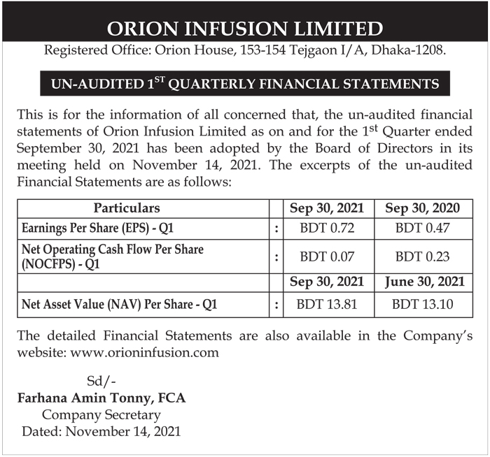 Un-audited Half Yearly (Q2) Financial Statements of Orion Infusion Ltd