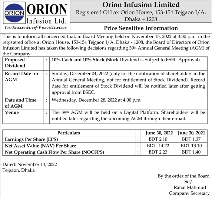 Price Sensitive Information (Q1) of Orion Infusion Ltd