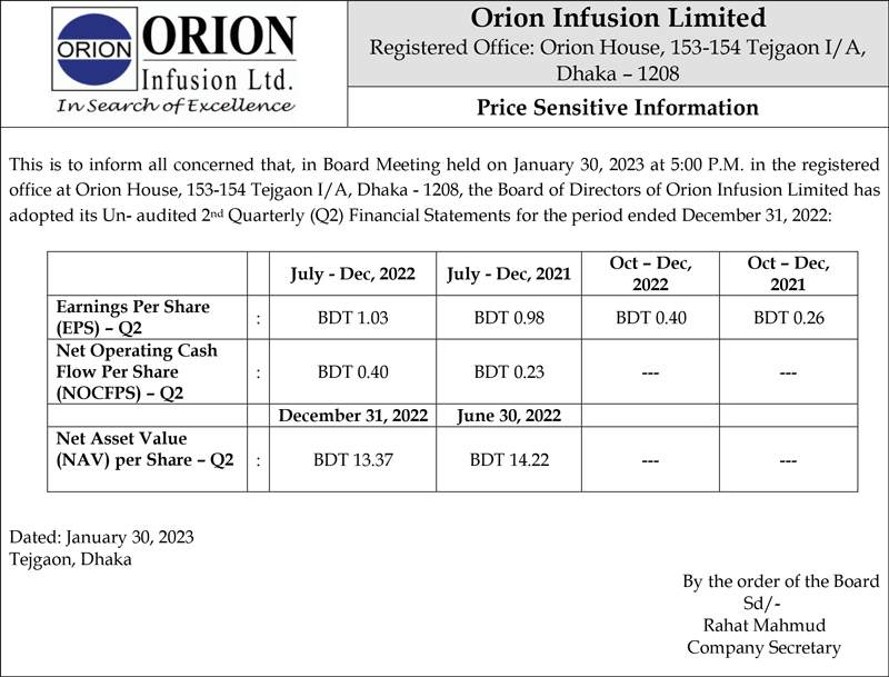 Price Sensitive Information of Orion Infusion Ltd
