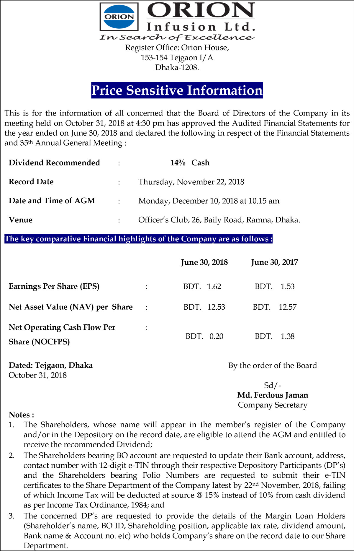 Price Sensitive Information (Q1) of Orion Infusion Ltd