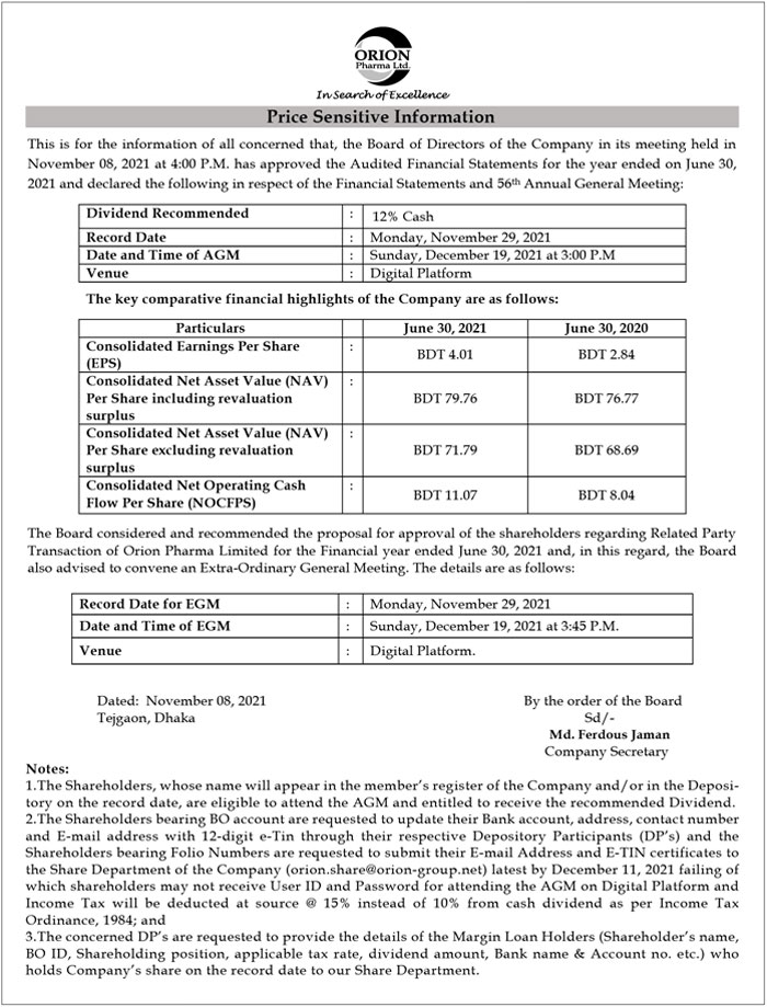 Price Sensitive Information (Q1) of Orion Pharma Ltd