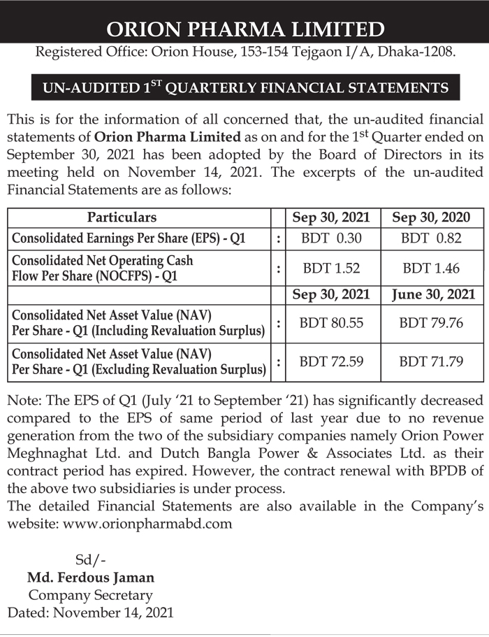 Un-audited Q3 Financial Statements of Orion Pharma Ltd.