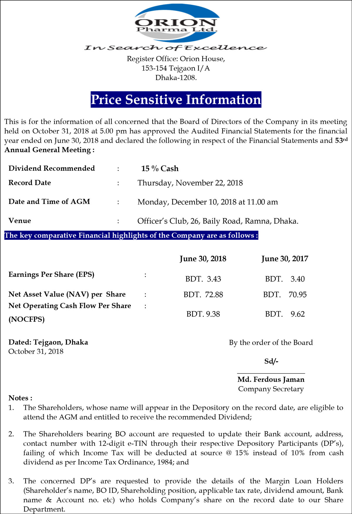 Price Sensitive Information (Q1) of Orion Pharma Ltd