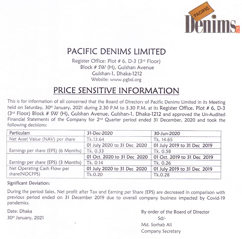 Price Sensitive Infomation of Pacific Denims Limited