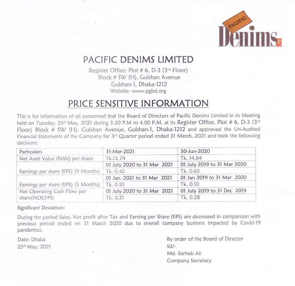 Price Sensitive Infomation of Pacific Denims Limited