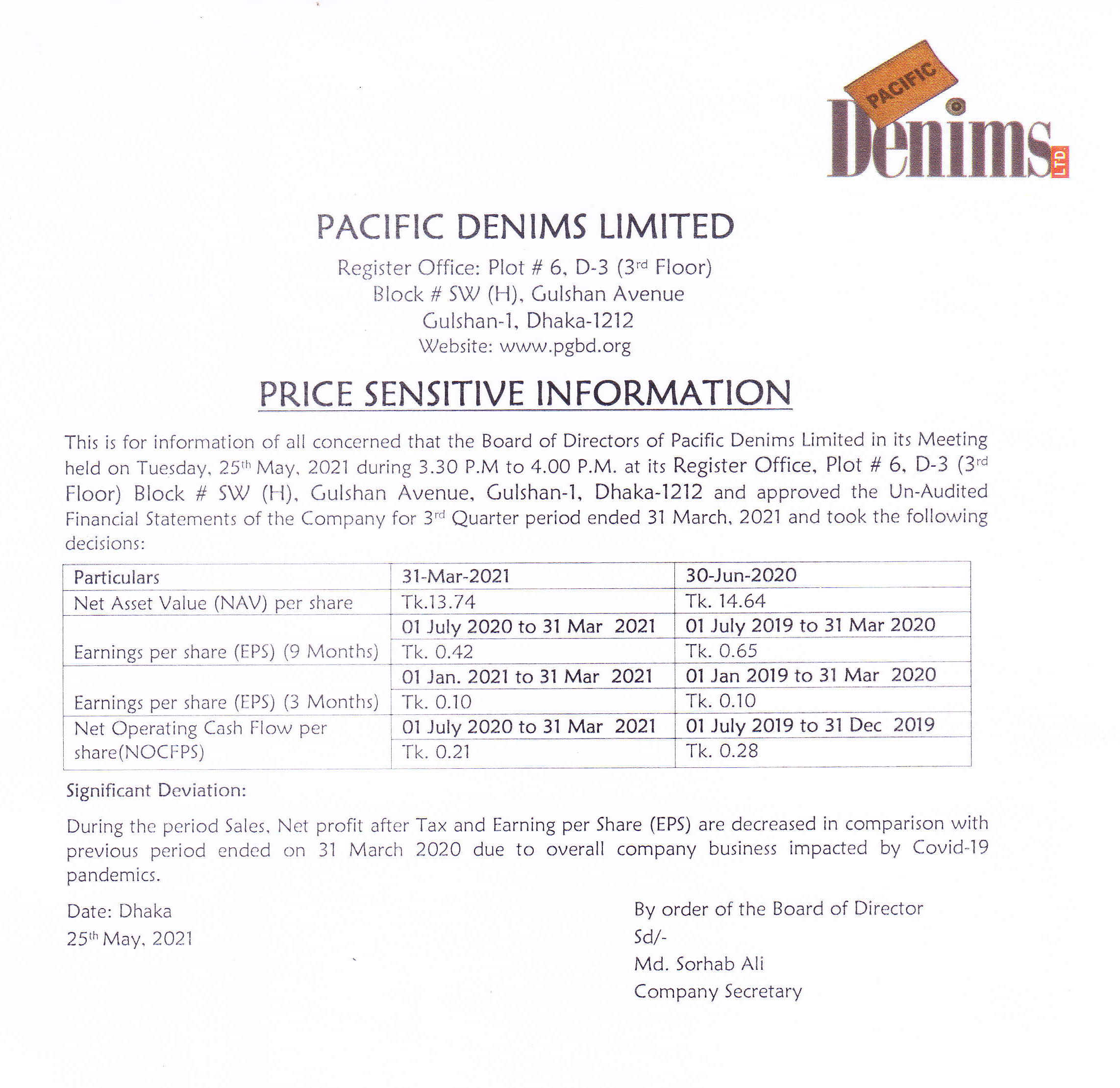 Price Sensitive Information of Pacific Denims Limited