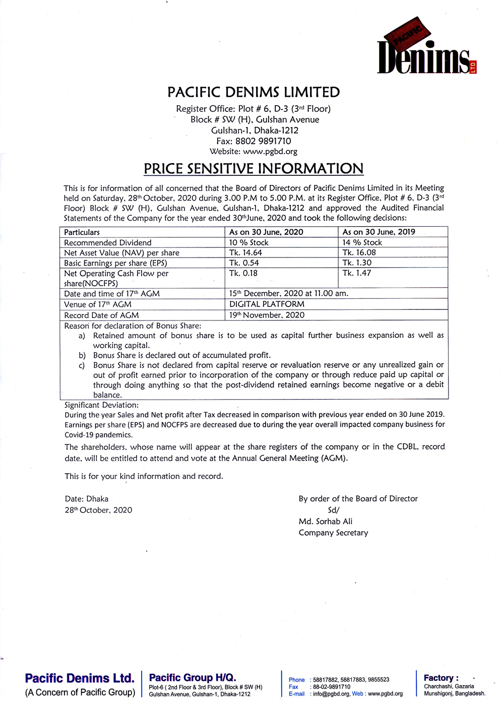 Price Sensitive Infomation of Pacific Denims Limited