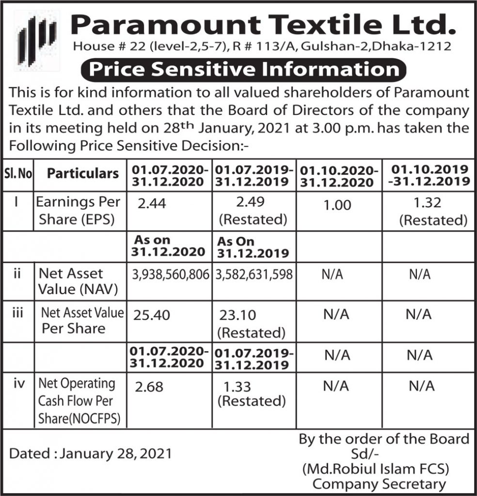 Statements of Financial Position (Un-audited) of Paramount Textile Limited