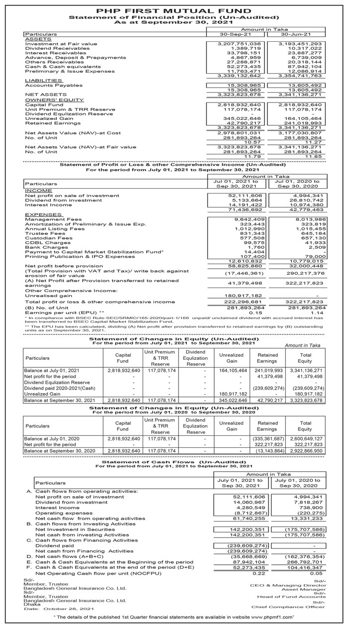 Un-audited Statements of Financial Position of PHP First Mutual Fund