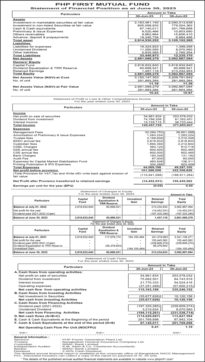 Un-audited Statements of Financial Position of PHP First Mutual Fund