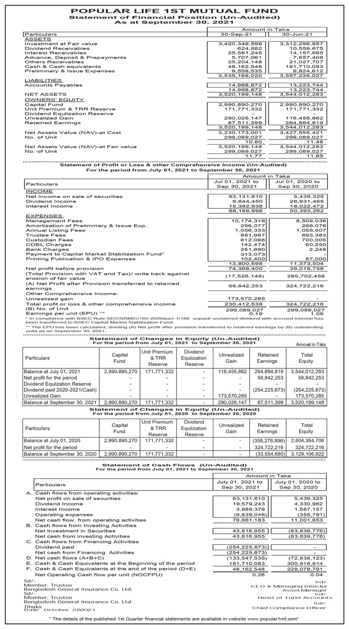 Un-audited Statements of Financial Position of Popular Life First Mutual Fund