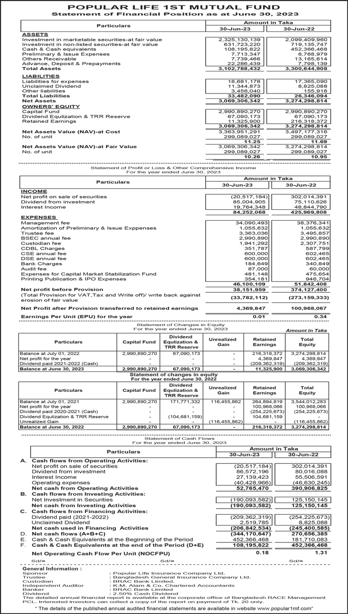 Un-audited Statements of Financial Position of Popular Life First Mutual Fund