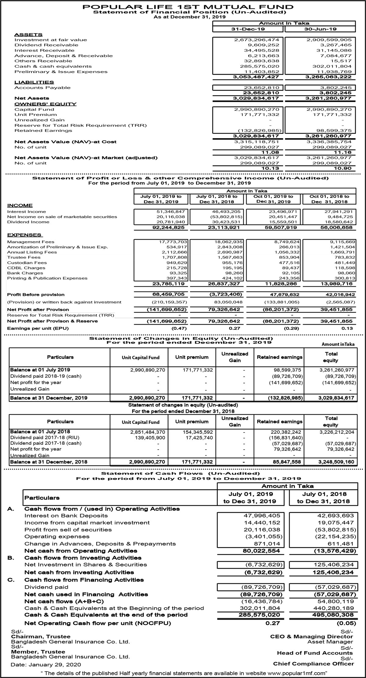 Un-audited Statements of Financial Position of Popular Life First Mutual Fund