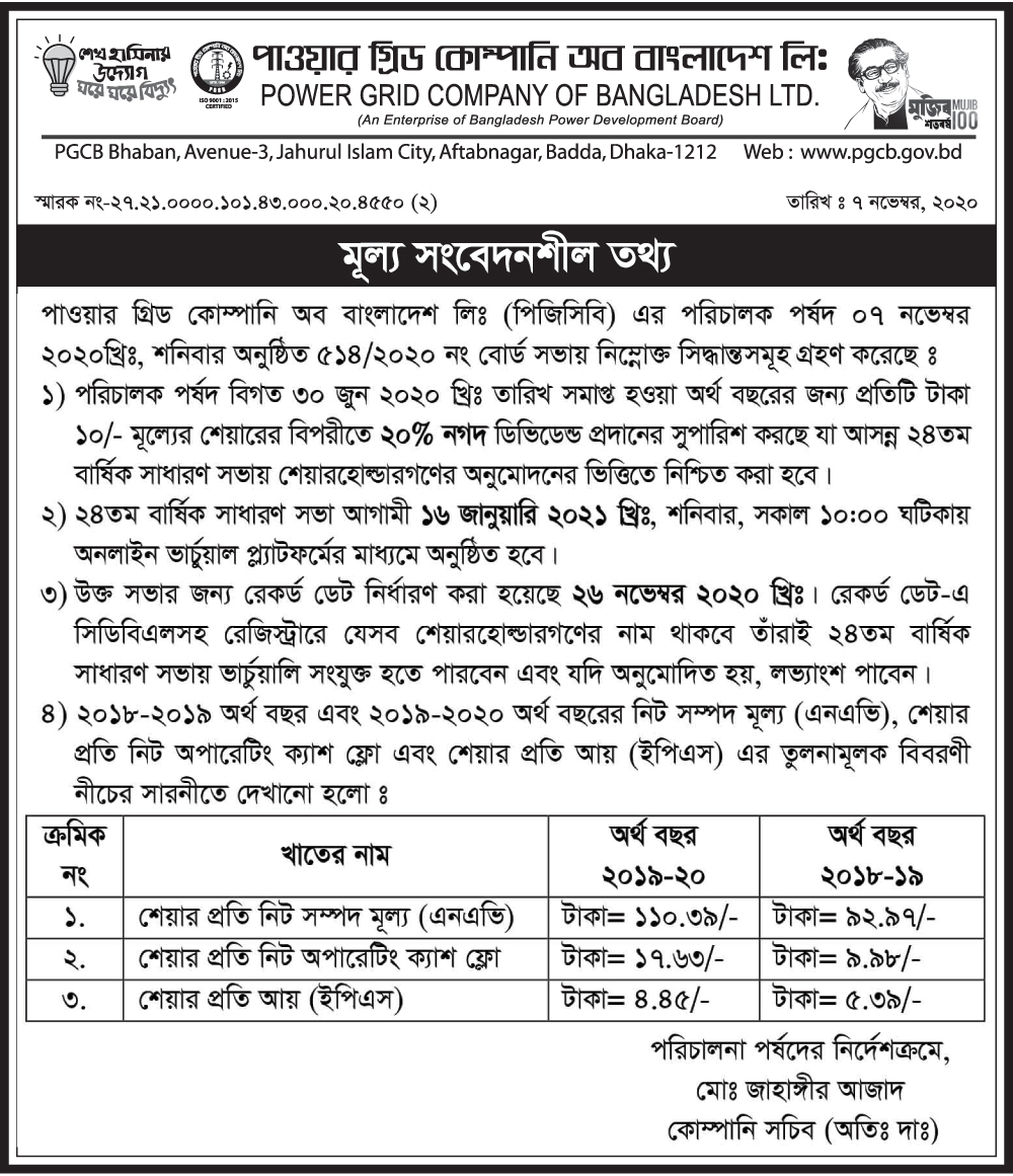 Price Sensitive Information of Power Grid Company of Bangladesh Ltd
