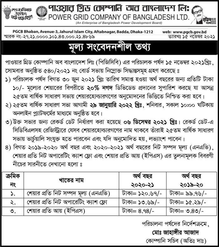 Price Sensitive Information of Power Grid Company of Bangladesh Ltd