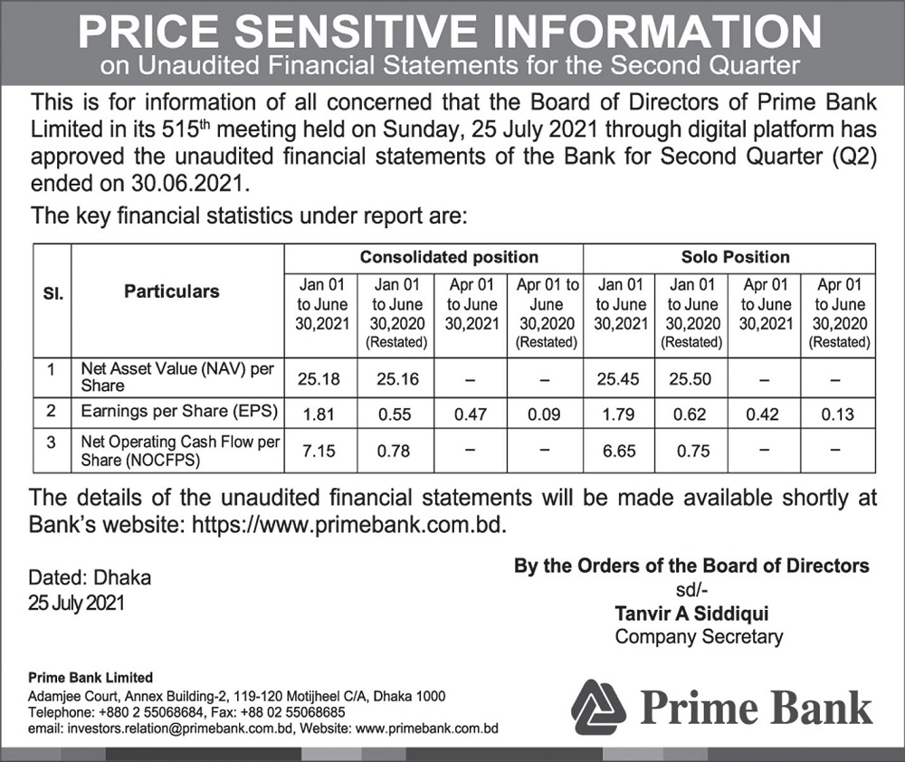 Half Yearly Un-audited Financial Statements of Prime Bank
