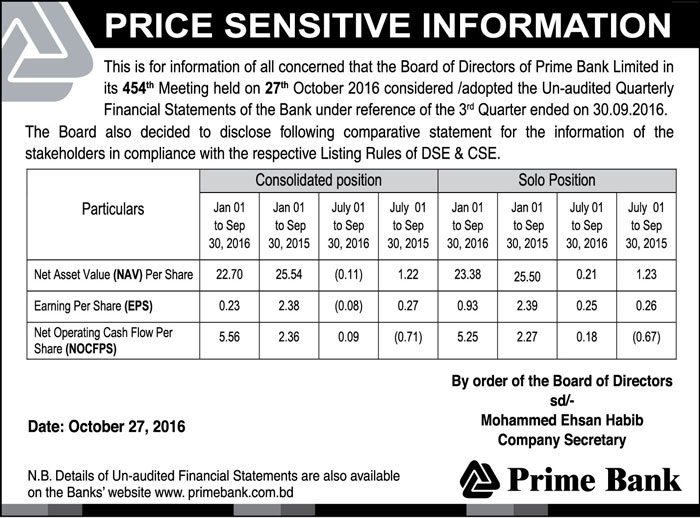 Price Sensitive Information of Prime Bank