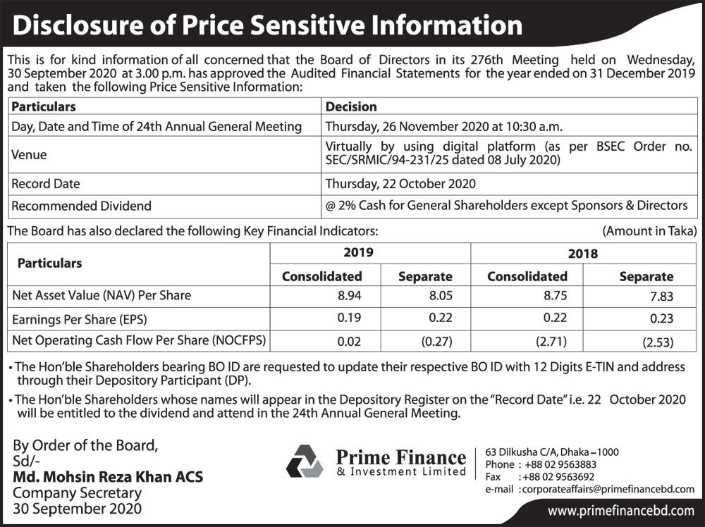 Price Sensitive Information of Prime Finance & Investment Ltd
