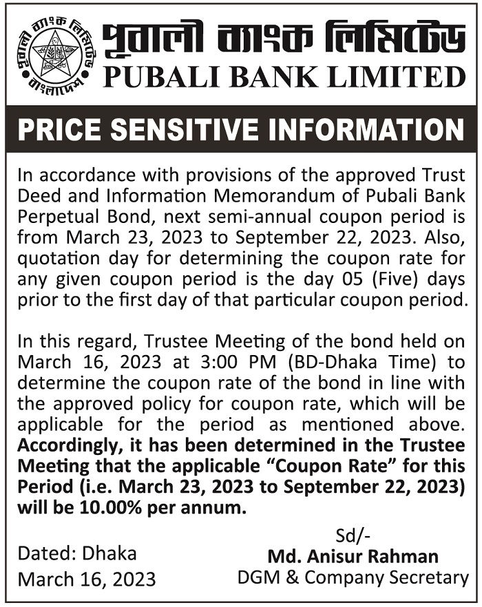 Price Sensitive Information of Pubali Bank Limited