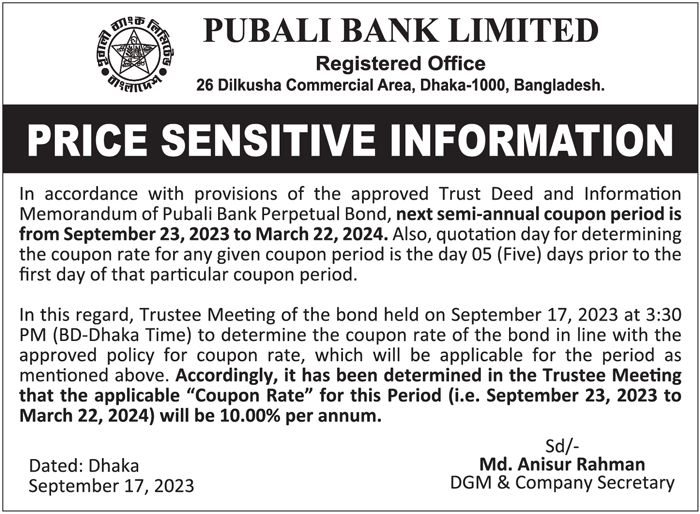Price Sensitive Information of Pubali Bank Limited