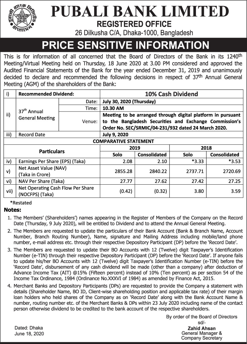 Half Yearly Financial Statements of Pubali Bank PLC.