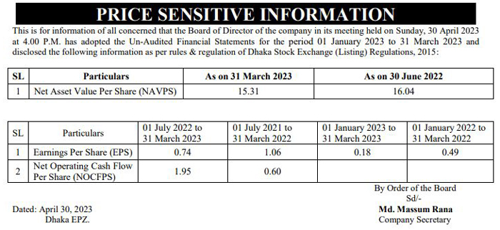 Price Sensitive Information of Queen South Textile Mills Ltd.