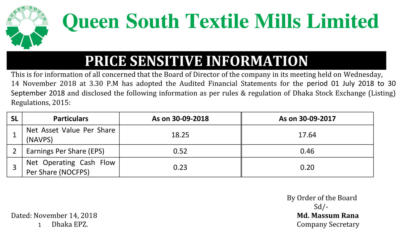 Price Sensitive Information of Queen South Textile Mills Ltd.