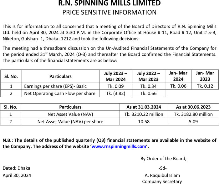 Price Sensitive Information of R.N. Spinning Mills Limited