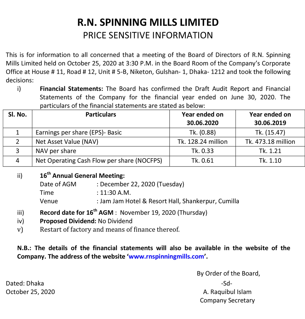 Price Sensitive Information of R.N. Spinning Mills Limited