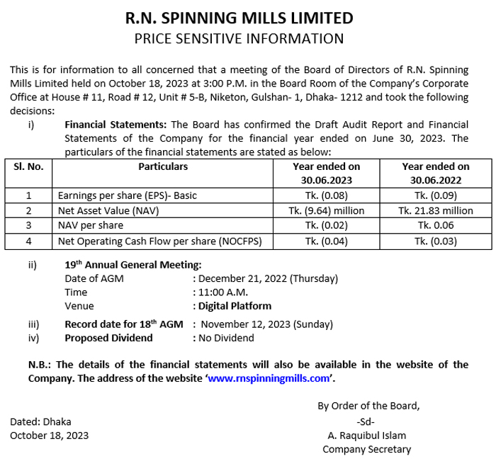 Price Sensitive Information of R.N. Spinning Mills Limited