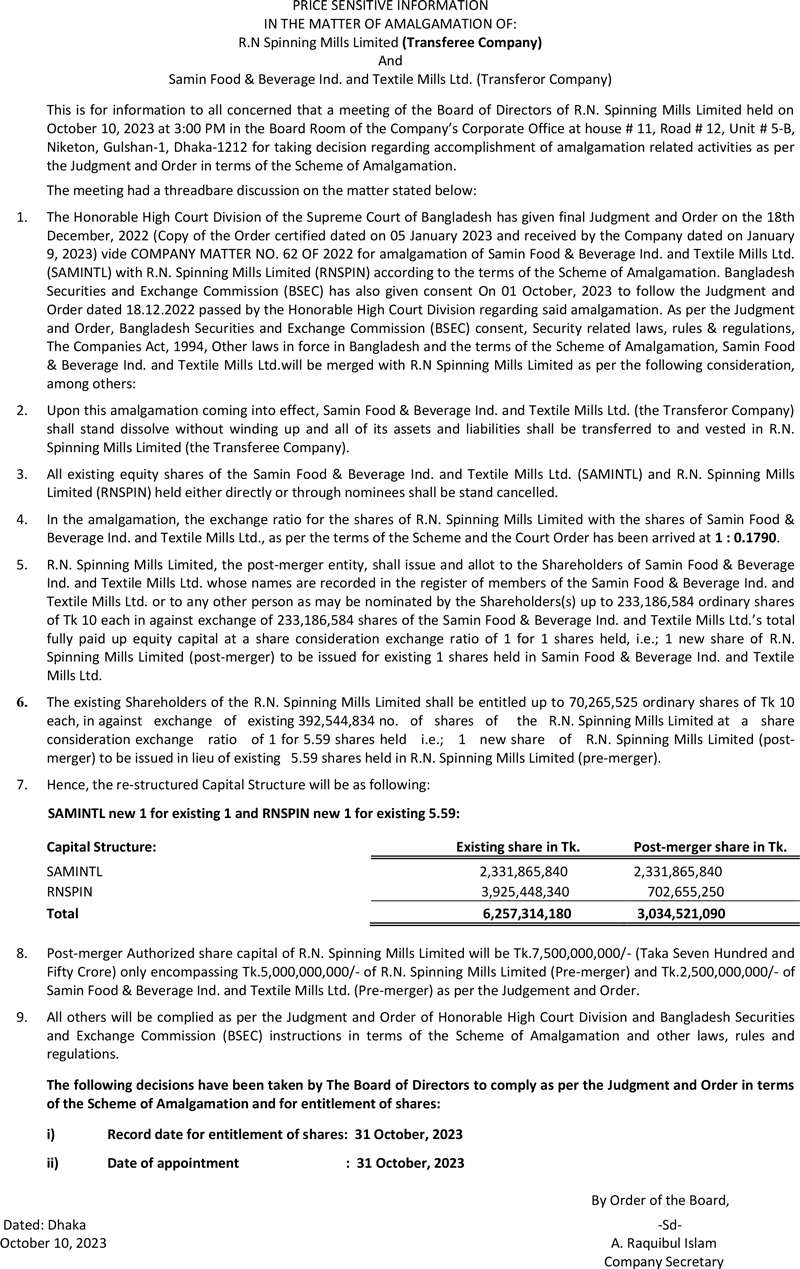 Price Sensitive Information of R.N Spinning Mills Limited and Samin Food & Beverage Ind. and Textile Mills Ltd.