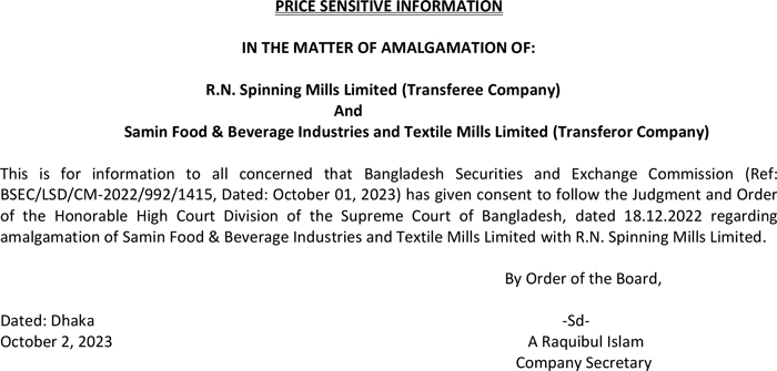 Price Sensitive Information of R.N. Spinning Mills Ltd. and Samin Food & Beverage Industries and Textile Mills Ltd.