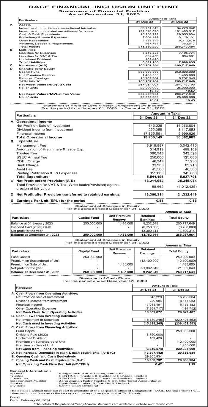Statements of Financial Position (Un-Audite) of RACE Financial Inclusion Unit Fund