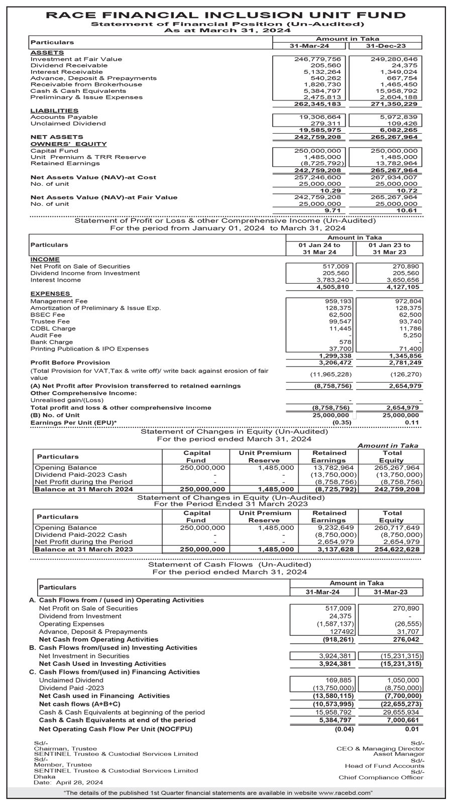 Statements of Financial Position (Un-Audite) of RACE Financial Inclusion Unit Fund