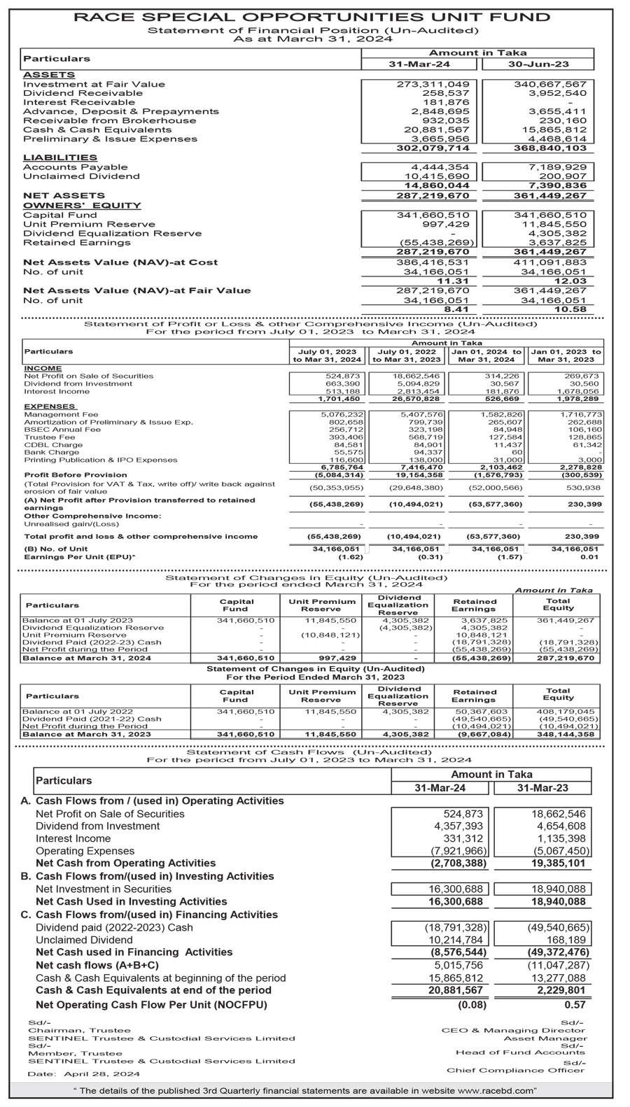 Statements of Financial Position (Un-Audite) of RACE Special Opportunities Unit Fund
