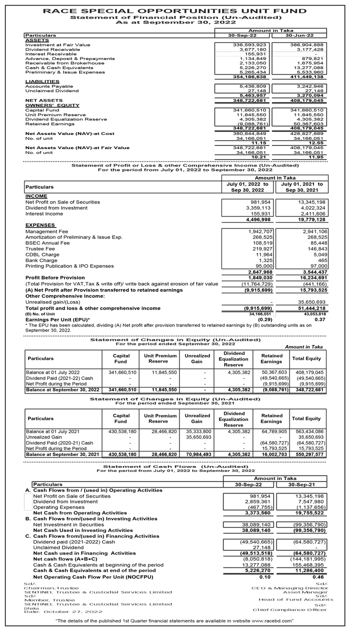 Statements of Financial Position (Un-Audite) of RACE Special Opportunities Unit Fund