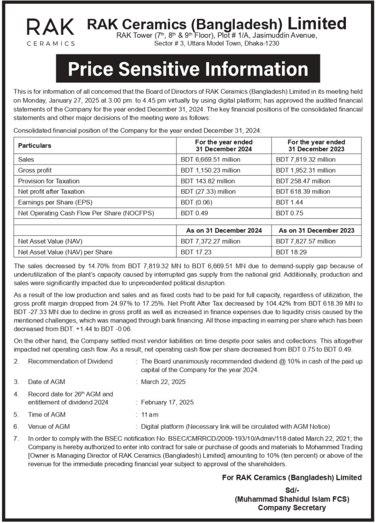 Price Sensitive Information of RAK Ceramics ( Bangladesh) Limited